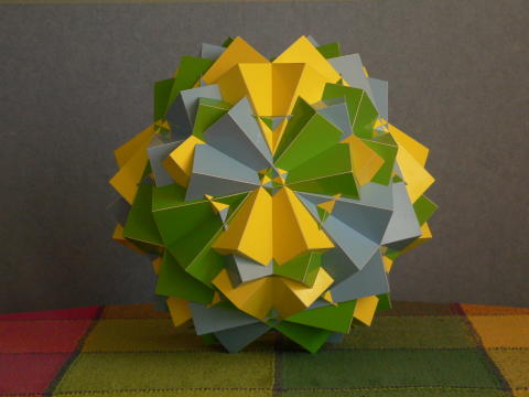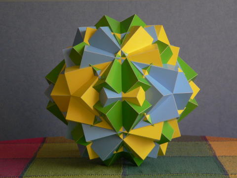 However the special position for this model isn't mentioned in the book, though it is clear that something special happens. For this compound the angle μ=(1/2)atan((4/7)√2) and for that angle the compound can be divided into three Bakos compounds (4|S4xI|D3xI). For each Bakos compound holds that one of the fourfold axes is shared with a fourfold axis of the compound; the other two axes share a twofold axis with the compound.