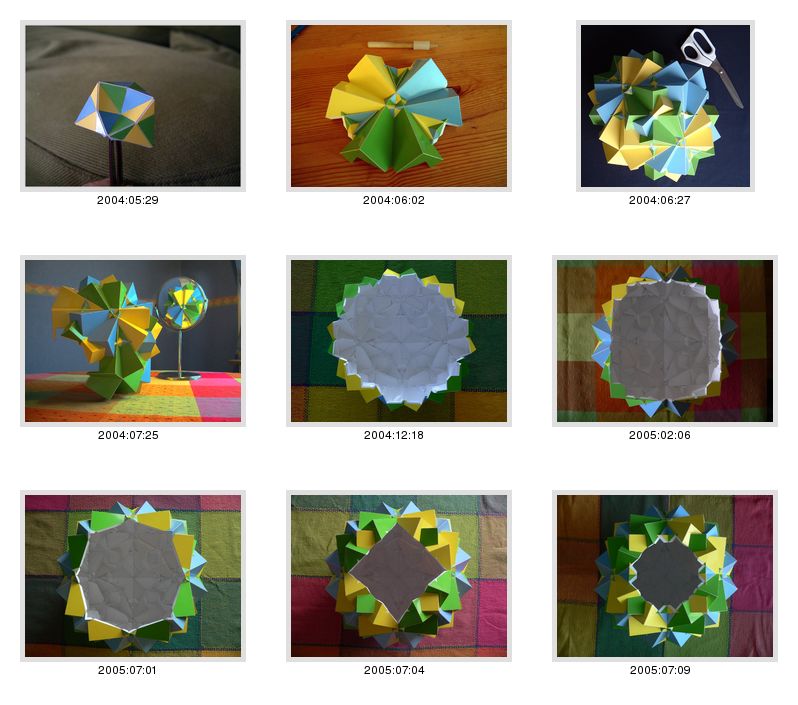 All calculations for this model were done algebraically and the summary of the calculation you can see here It also contains the templates and the adjusted templates that I am using, since some faces became so tiny that is was not very practical to build an exact model or I should have built a bigger model. Here you can see several stages of the construction of the model.